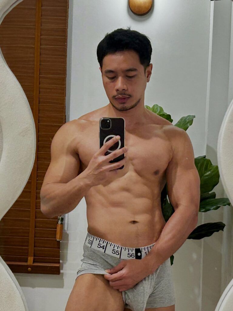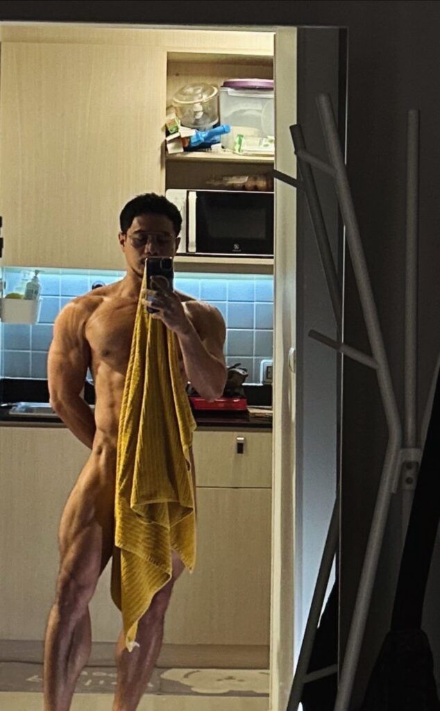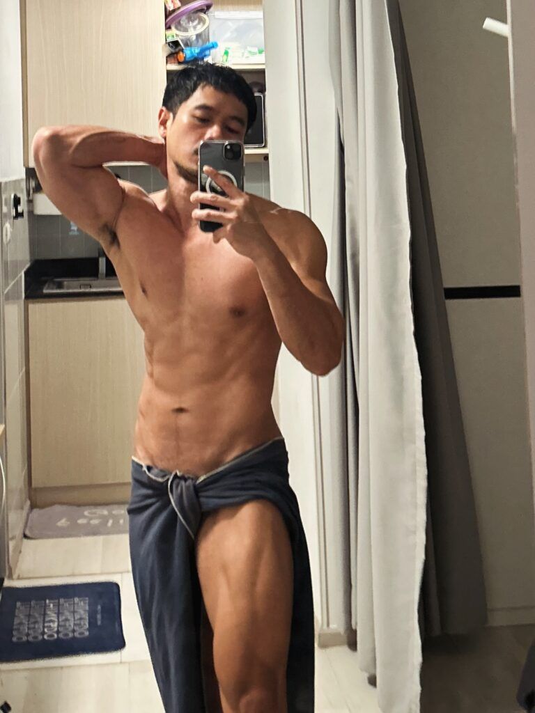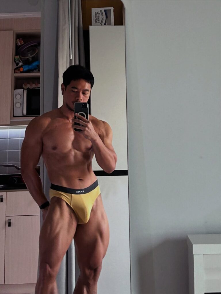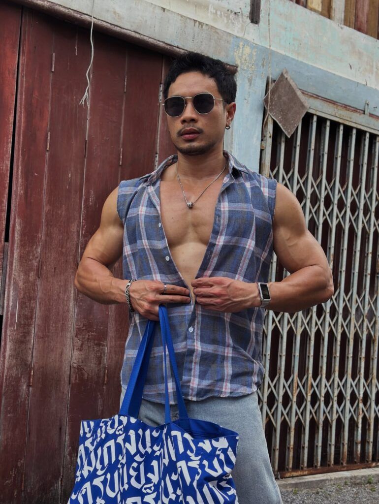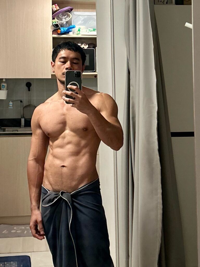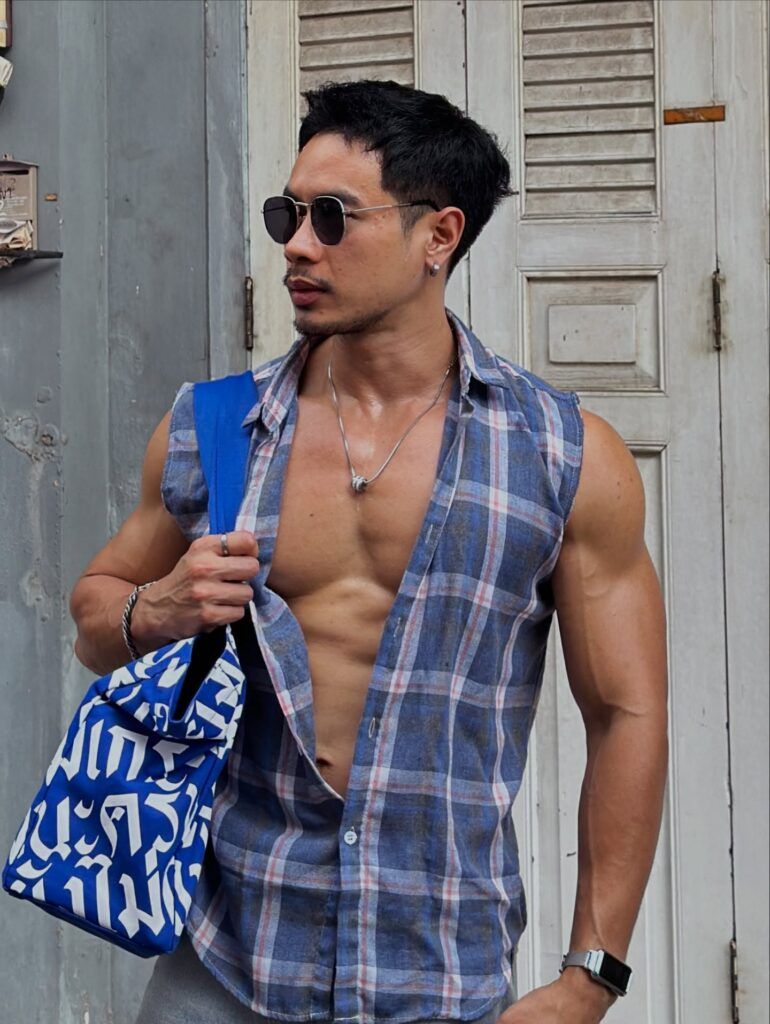 เรื่องหุ่นคือพูดได้เต็มปากว่า สมส่วนมาก ซิกแพคมาแบบไม่โหด แขน ไหล่ ช่วงตัวทุกอย่างบาลานซ์ ดูเป็นคนที่ออกกำลังกายสม่ำเสมอ ไม่เร่ง ไม่ฝืน แต่ผลลัพธ์ออกมาดีแบบเห็นชัด ยิ่งบวกกับผิวแทนกำลังดี ยิ่งทำให้ลุคโดยรวมดูมีเสน่ห์แบบไม่ต้องปรุงเพิ่ม