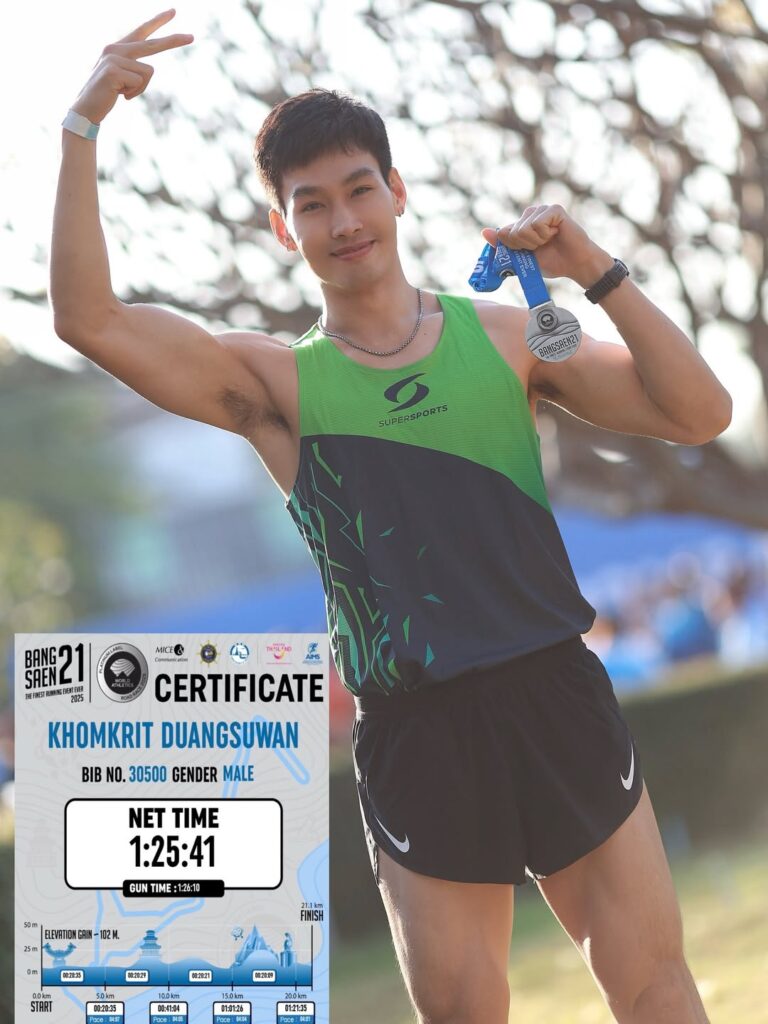 วันนี้พามาดูอีกหนึ่งนักวิ่งที่ฟอร์มกำลังมาแรงสุดๆ ในช่วงนี้ สำหรับ ป่าน คมกฤษณ์ ดวงสุวรรณ์ ที่ล่าสุดไปจัดเต็มในงาน Bangsaen 21 และทำผลงานได้แบบน่าปรบมือ ด้วยการกด NEW PB 1:25:41 ไปเลย บอกเลยว่าไม่ธรรมดา เพราะงานนี้ขึ้นชื่อว่าโหดทั้งเส้นทางและการแข่งขัน แต่เจ้าตัวก็ยังเอาอยู่ วิ่งนิ่ง วิ่งแรง จบสวยแบบคนซ้อมมาดีจริง