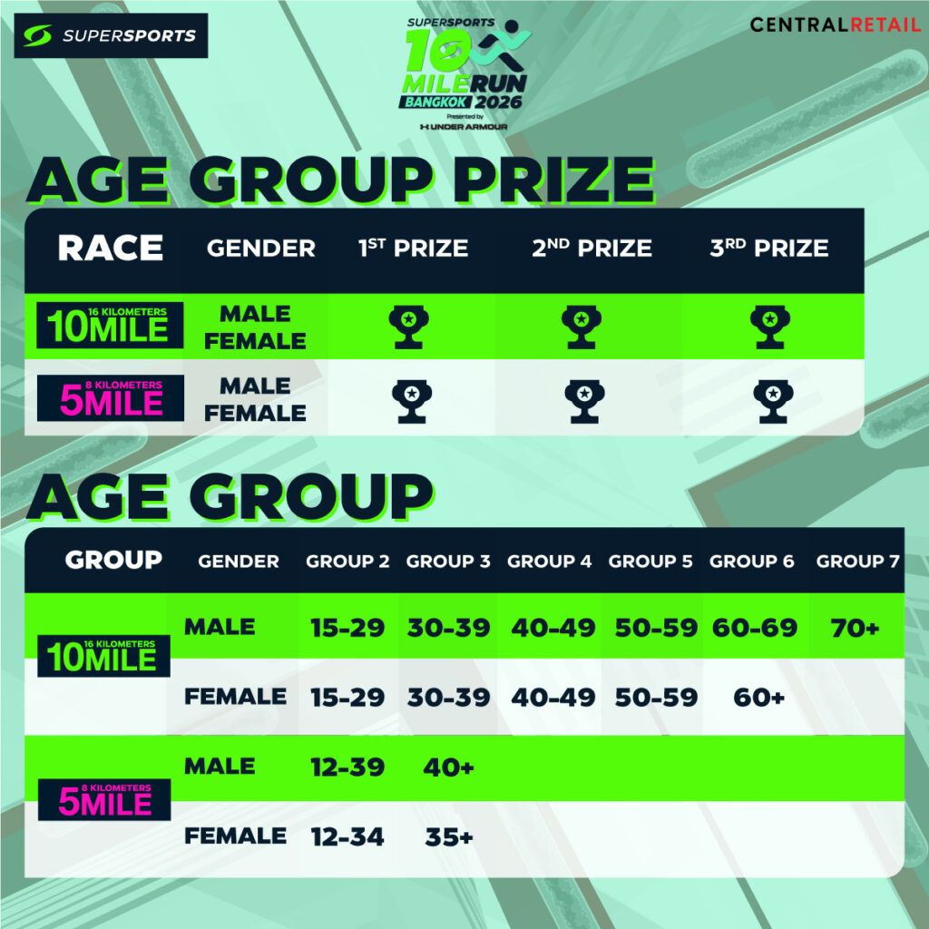 • Age Group อันดับ 1–3 (ชาย/หญิง) – ถ้วย (Chip Time)