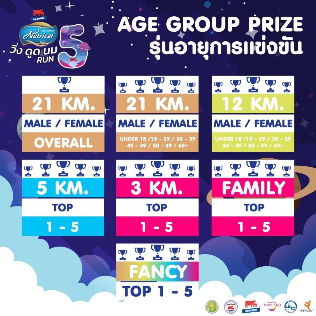 • แบ่ง 6 รุ่นอายุ ชาย/หญิง รุ่นละ 5 รางวัล