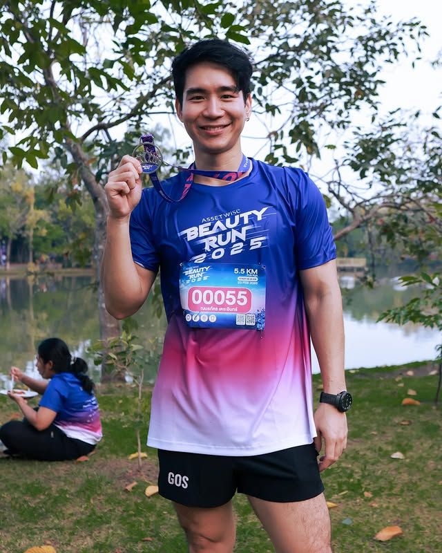 ดีกรีก็ไม่ธรรมดา เพราะเคยคว้าตำแหน่ง 3rd Runner Up จากเวที Mister International Thailand 2024 ทำให้หลายคนคุ้นหน้าคุ้นตากันมาก่อนอยู่แล้ว พอมาเห็นในสนามวิ่งก็ยิ่งรู้สึกว่าเป็นหนุ่มที่ครบทั้งลุคและไลฟ์สไตล์สุขภาพ